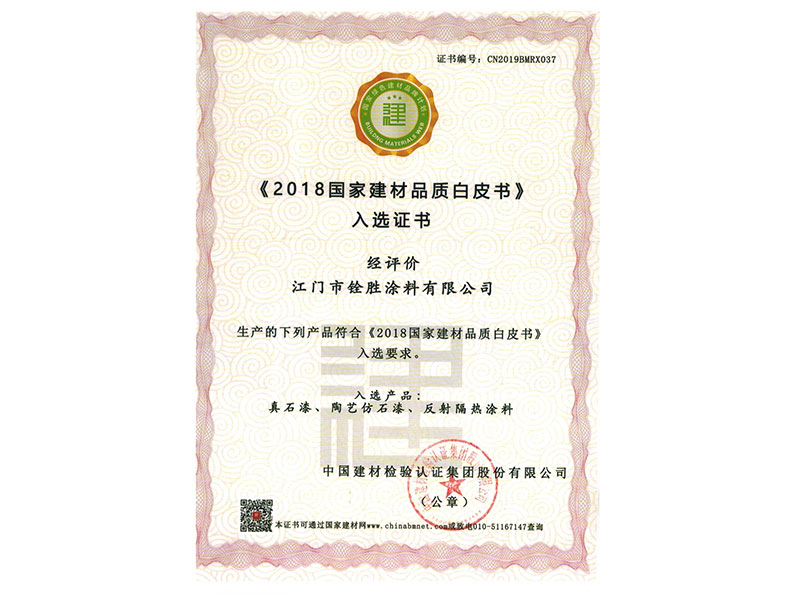 《2018國家建材品質(zhì)白皮書》入選證書